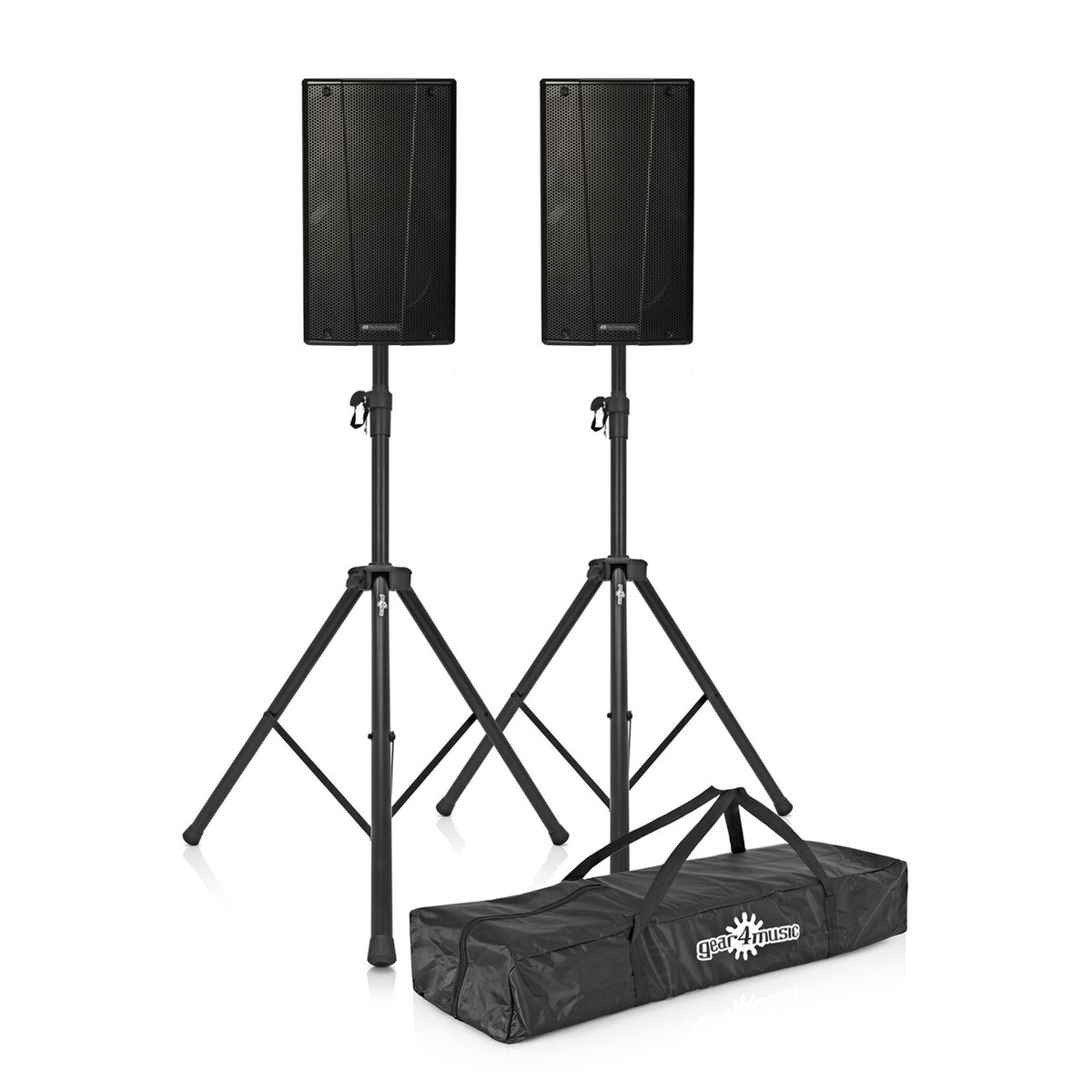 The dB Technologies B-Hype 8 speaker bundle includes two height-adjustable speaker stands with a carry bag.